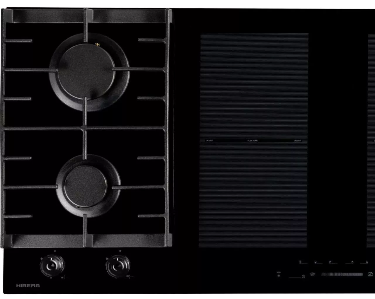 Газовая часть включает две конфорки с автоматическим розжигом от ручки и системой газ-контроля для безопасной эксплуатации. Чугунные решетки обеспечивают устойчивость посуды и рассчитаны на интенсивное использование. Наличие сенсора распознавания посуды и индикатора остаточного тепла добавляет уверенности при работе.