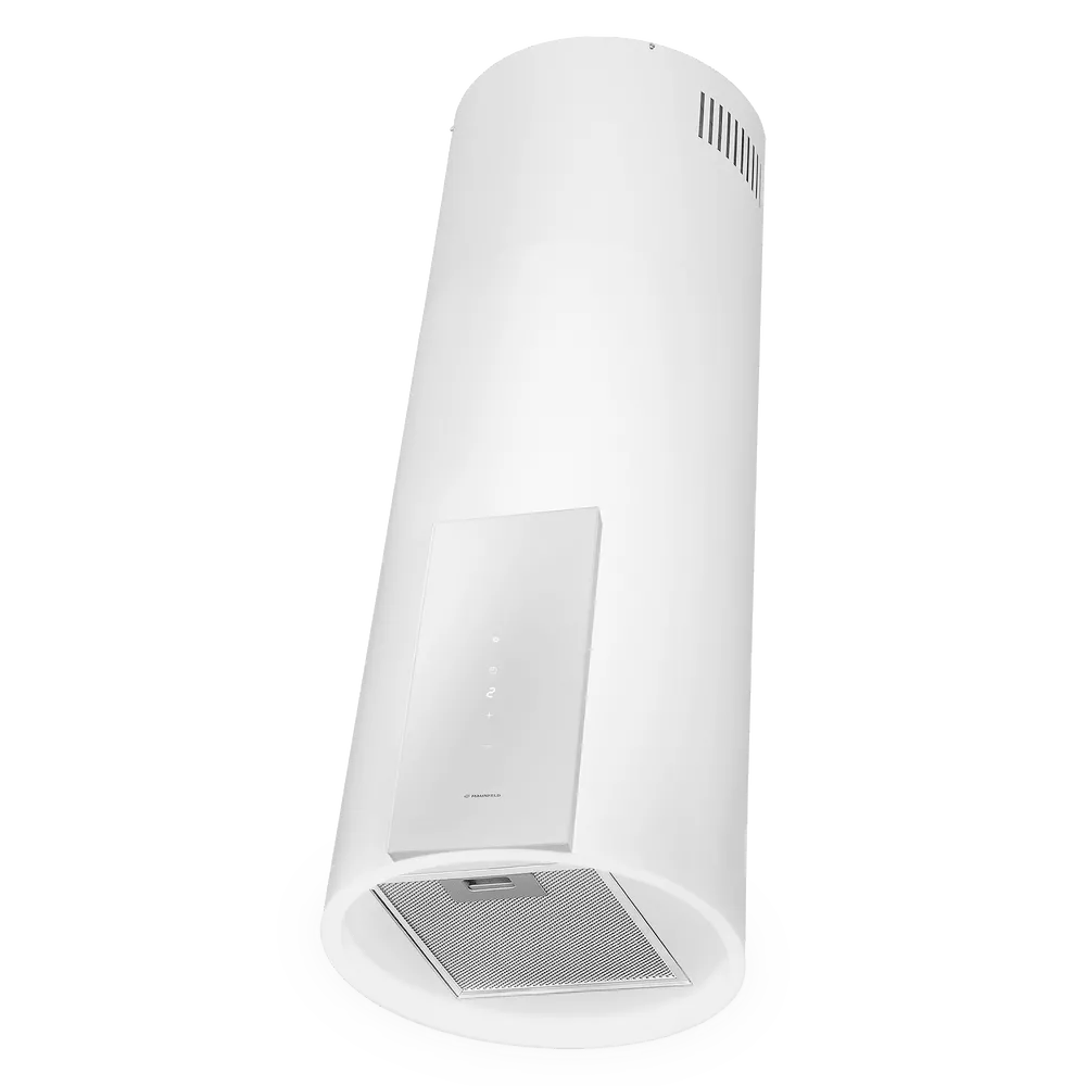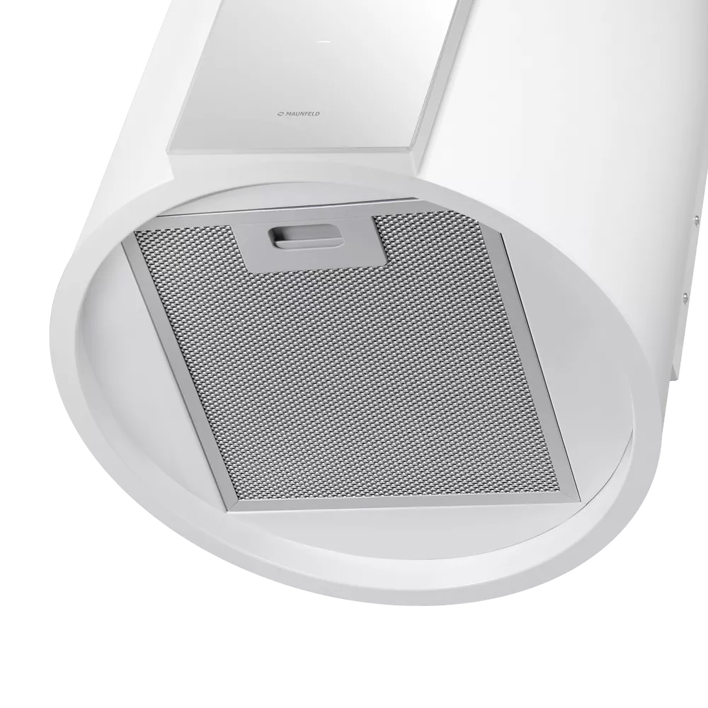 Кухонная вытяжка MAUNFELD ALBA 39 Isla белый — стильное решение для островной планировки и просторных кухонь. Цилиндрический корпус аккуратно крепится к потолку над варочной поверхностью и органично дополняет современный интерьер.
