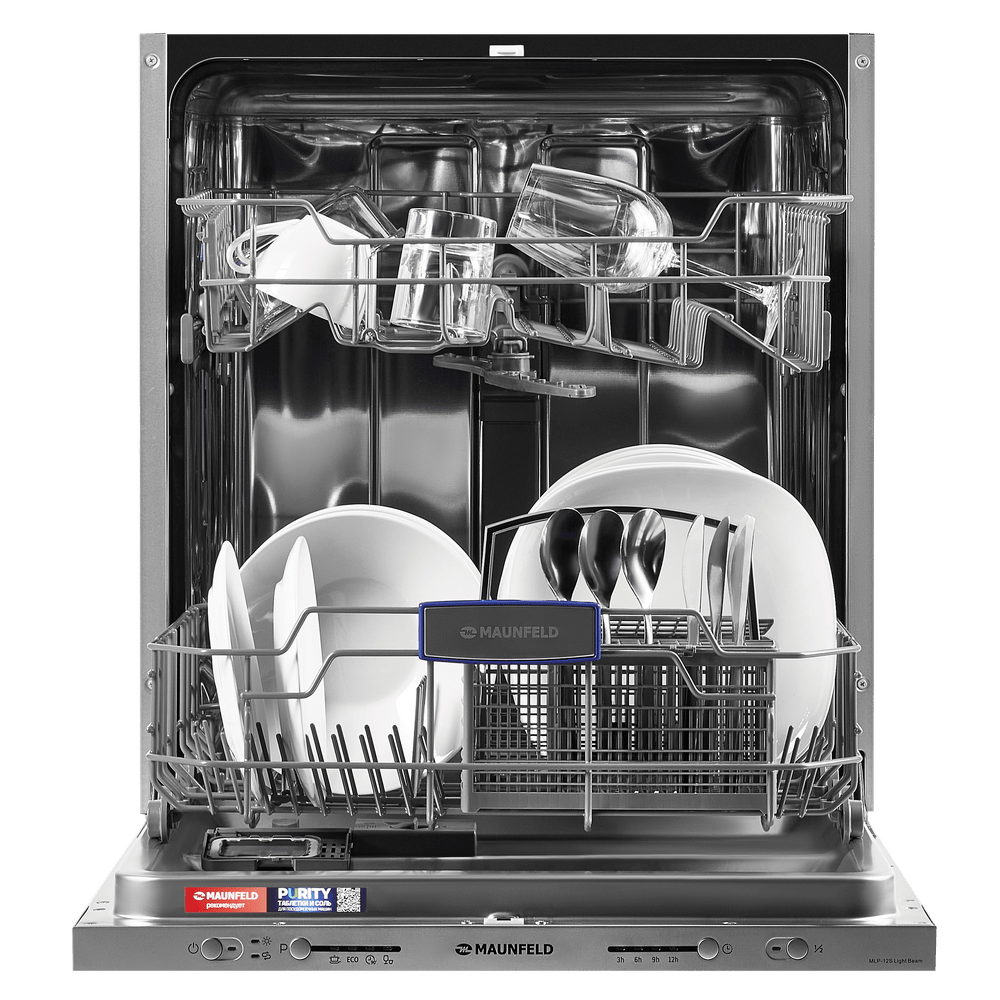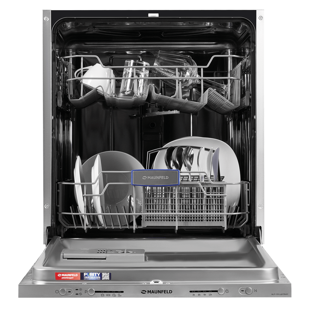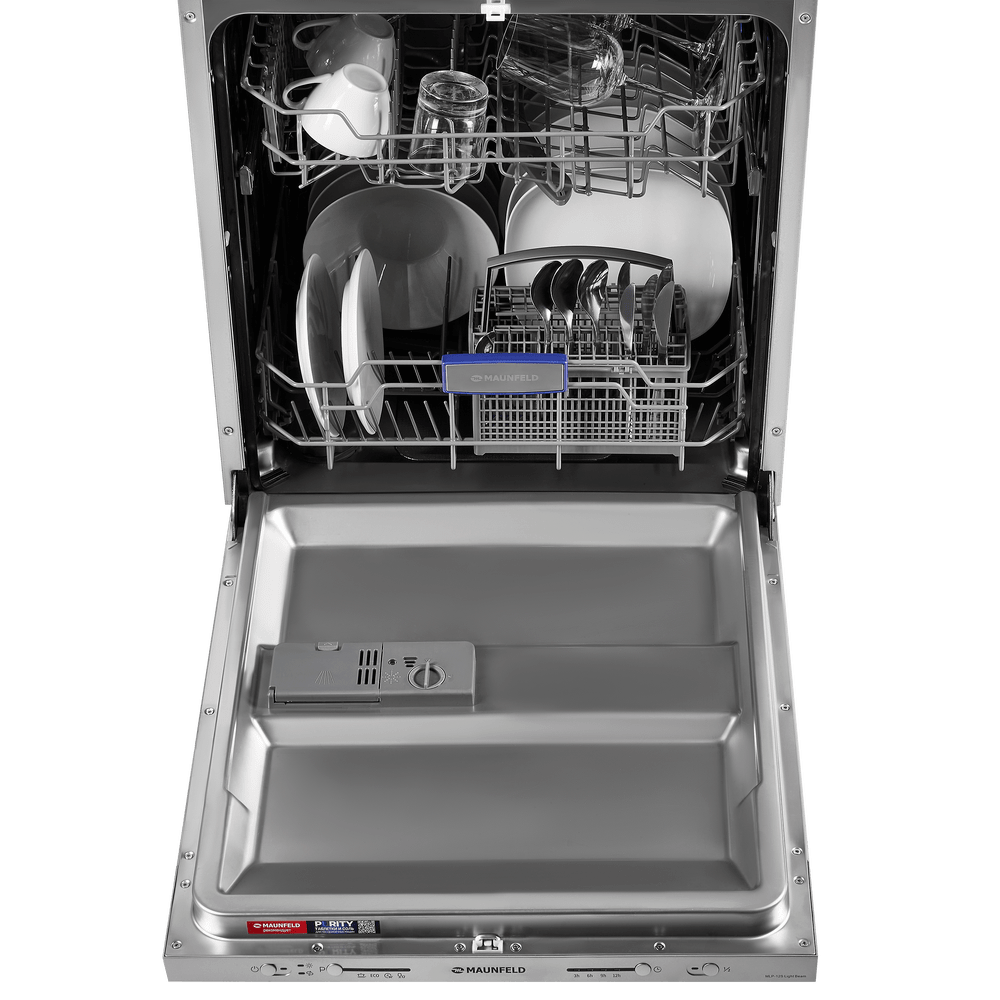 Полноразмерная встраиваемая посудомоечная машина MAUNFELD MLP-12S Light Beam рассчитана на 12 комплектов посуды и подходит для кухни шириной 60 см. Внутренняя поверхность выполнена из нержавеющей стали толщиной 0.6–0.8 мм, что обеспечивает надежность при активной эксплуатации. Для экономного потребления ресурсов модель предлагает Класс энергетической эффективности A++.