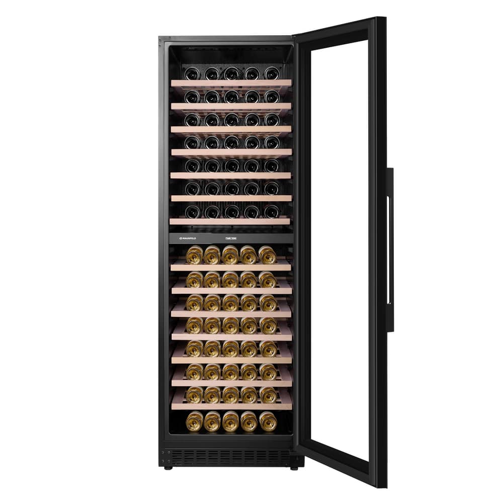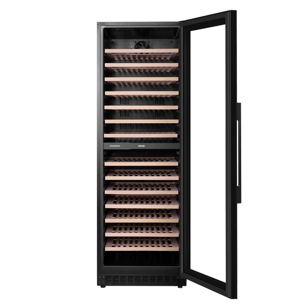 Винный шкаф Maunfeld MBWC-415D171 — встраиваемая модель, выполненная в черном цвете. Вместительность составляет  171 бутылка, а полезный объем равен 415 л. Сенсорное управление позволит легко установить требуемую температуру. Шкаф имеет две зоны, для каждой из них можно задать свой режим охлаждения, что будет полезно для размещения разных сортов вин.
